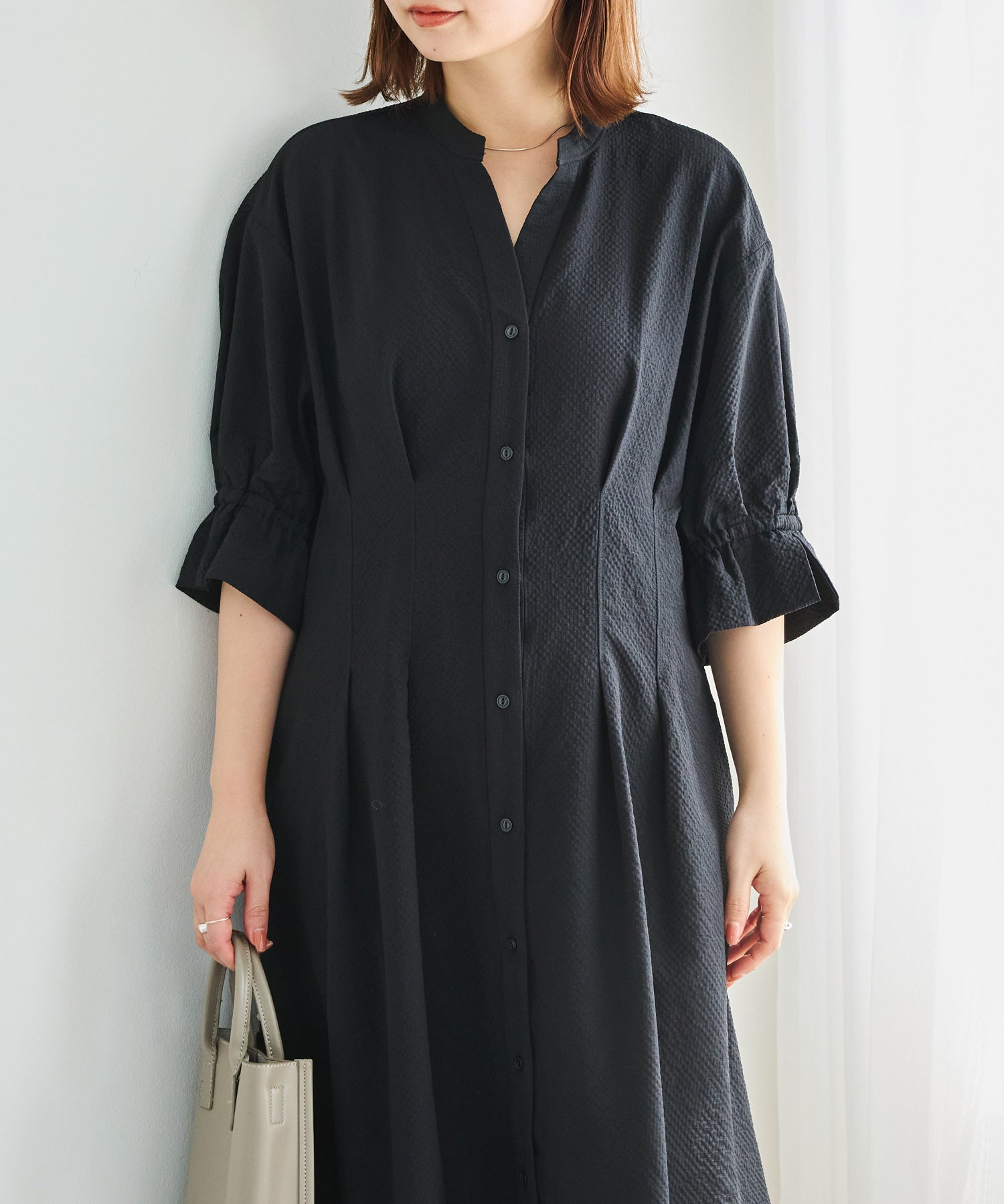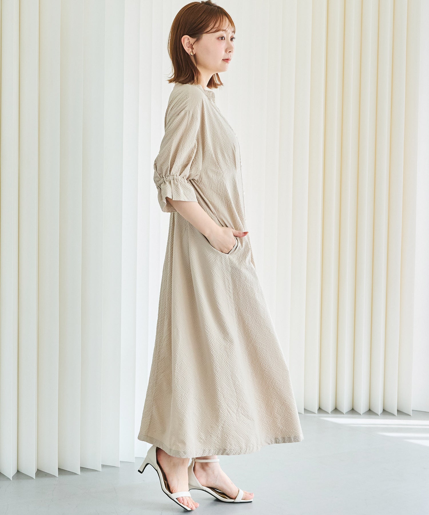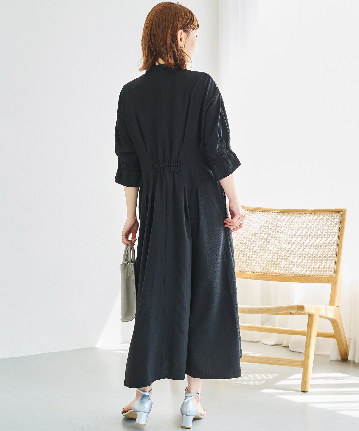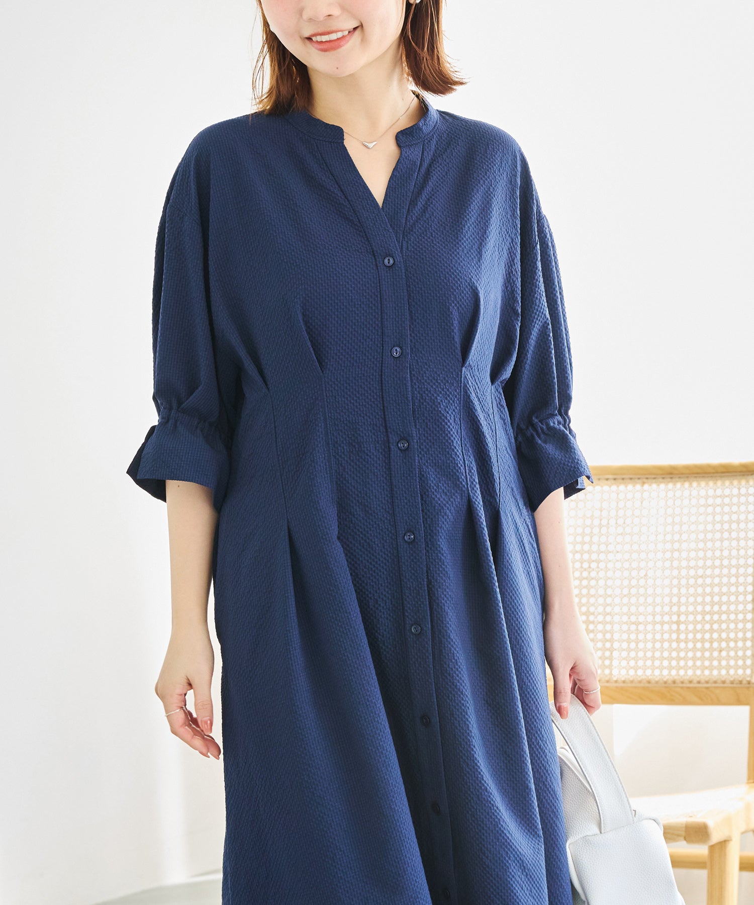 ■デザインスキッパーネックで首元をすっきりと見せ、抜け感のある印象に仕上げました。フロントはボタン仕様で、ワンピースとしてはもちろん、前を開けて羽織りとしても着用可能です。ウエストにはタックと背中ゴムを施し、立体的で女性らしいシルエットを演出。袖はふんわりとしたボリュームスリーブに、袖口ゴム+スリットデザインをプラスしました。程よい抜け感と動きやすさを兼ね備えています。両サイドポケット付きで、デイリー使いに嬉しい実用性も◎