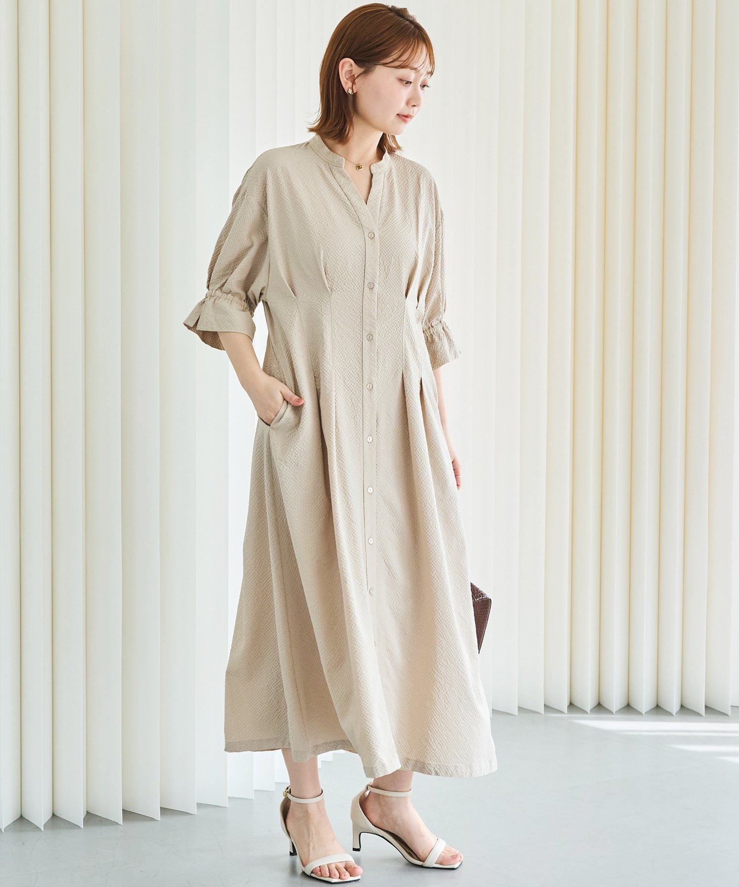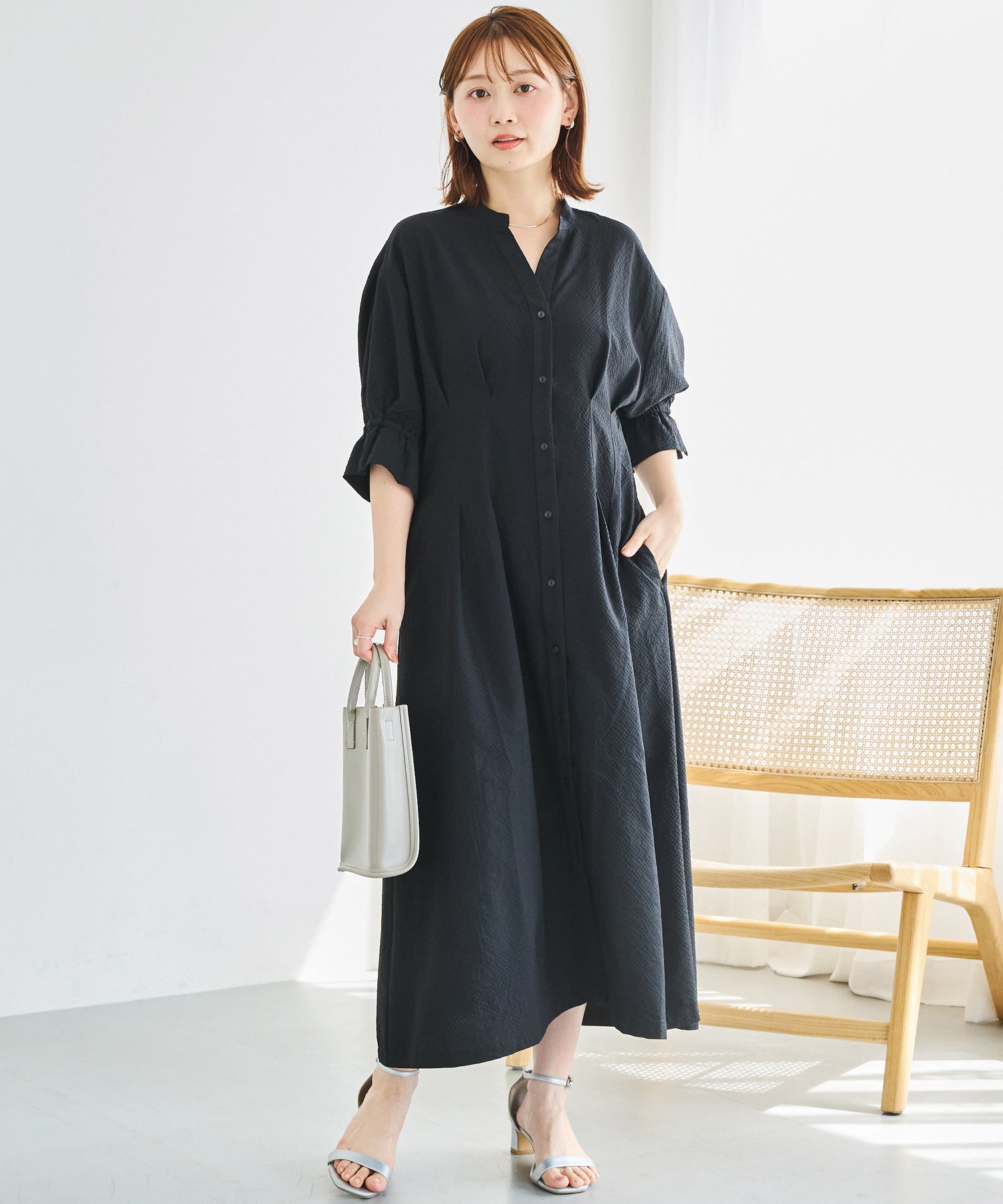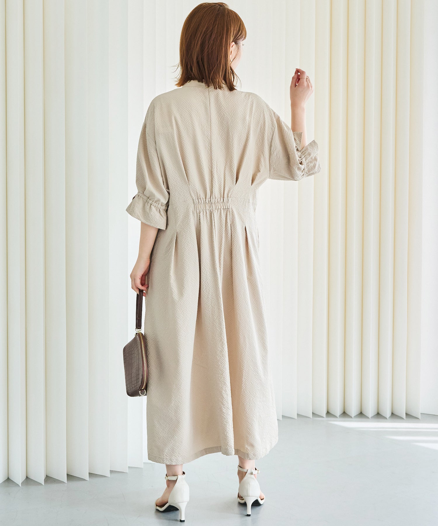 ■デザインスキッパーネックで首元をすっきりと見せ、抜け感のある印象に仕上げました。フロントはボタン仕様で、ワンピースとしてはもちろん、前を開けて羽織りとしても着用可能です。ウエストにはタックと背中ゴムを施し、立体的で女性らしいシルエットを演出。袖はふんわりとしたボリュームスリーブに、袖口ゴム+スリットデザインをプラスしました。程よい抜け感と動きやすさを兼ね備えています。両サイドポケット付きで、デイリー使いに嬉しい実用性も◎