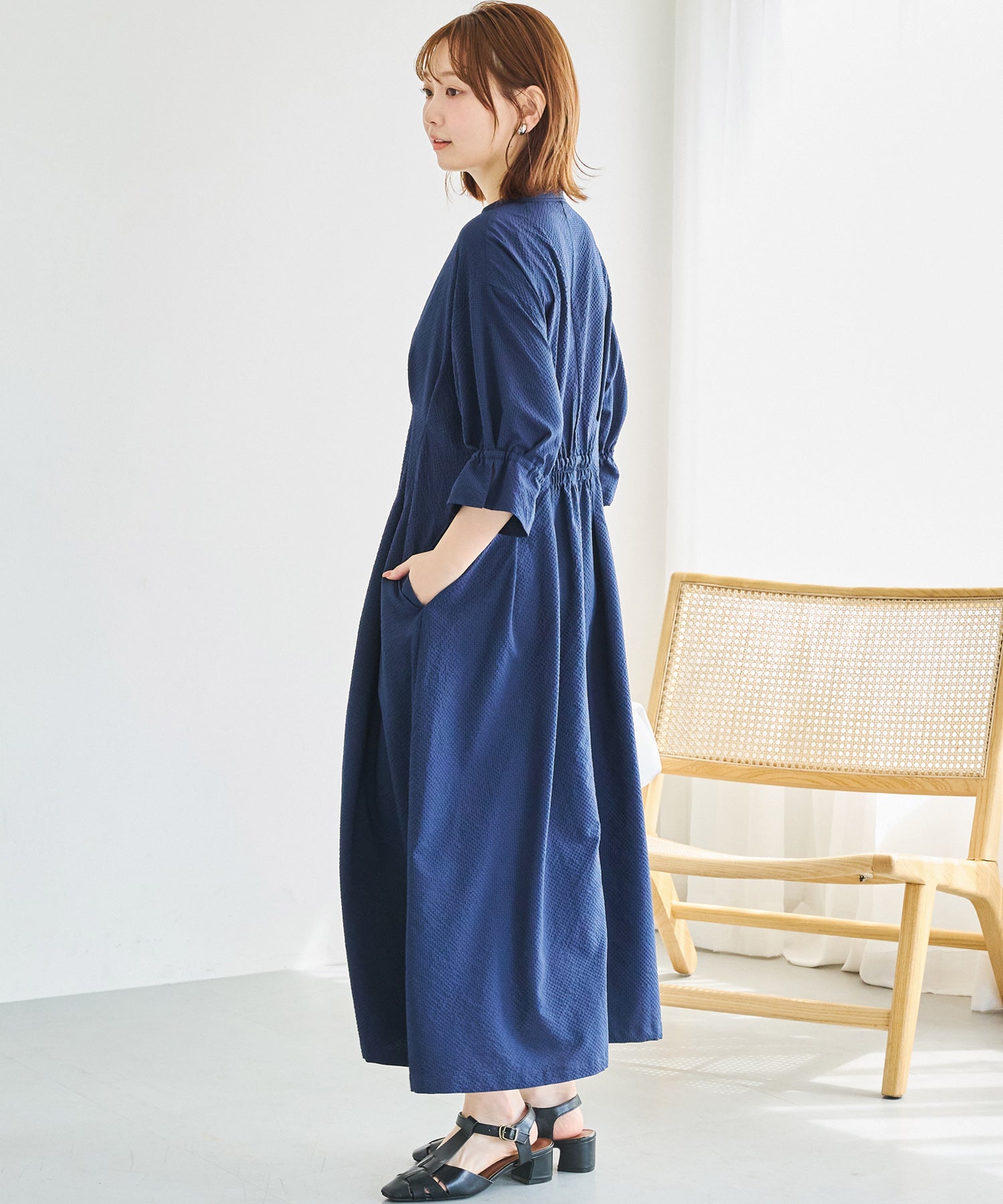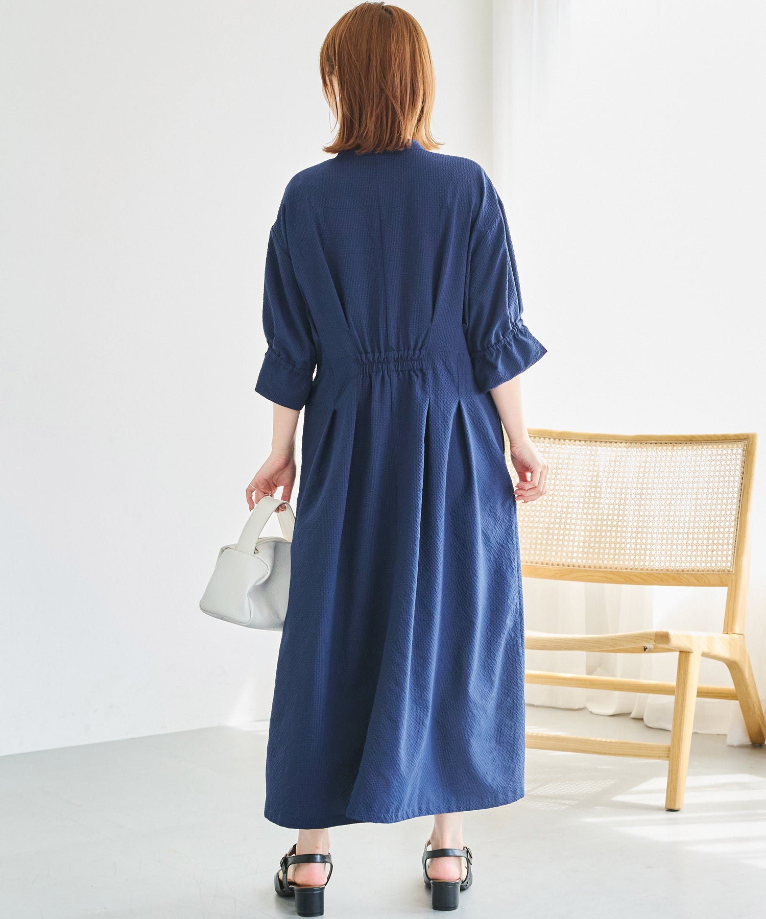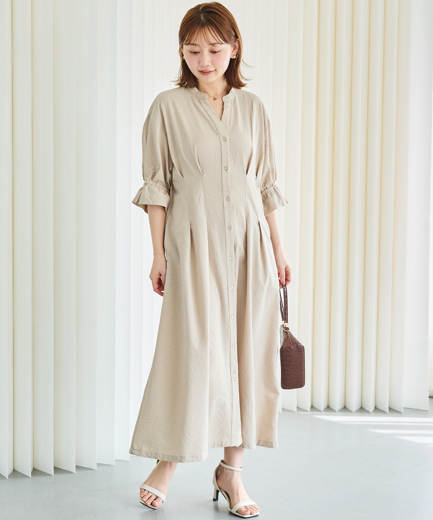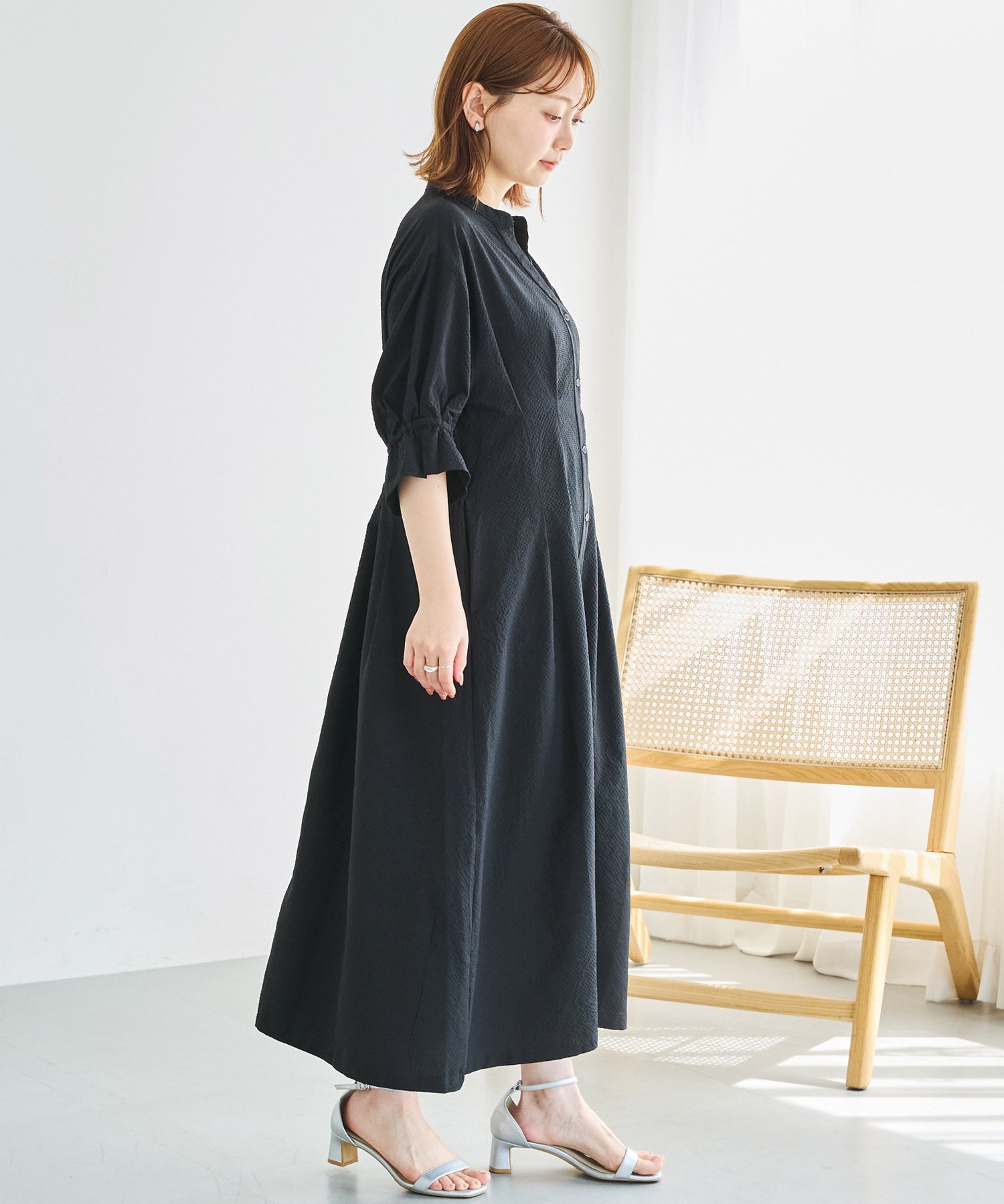 ■デザインスキッパーネックで首元をすっきりと見せ、抜け感のある印象に仕上げました。フロントはボタン仕様で、ワンピースとしてはもちろん、前を開けて羽織りとしても着用可能です。ウエストにはタックと背中ゴムを施し、立体的で女性らしいシルエットを演出。袖はふんわりとしたボリュームスリーブに、袖口ゴム+スリットデザインをプラスしました。程よい抜け感と動きやすさを兼ね備えています。両サイドポケット付きで、デイリー使いに嬉しい実用性も◎