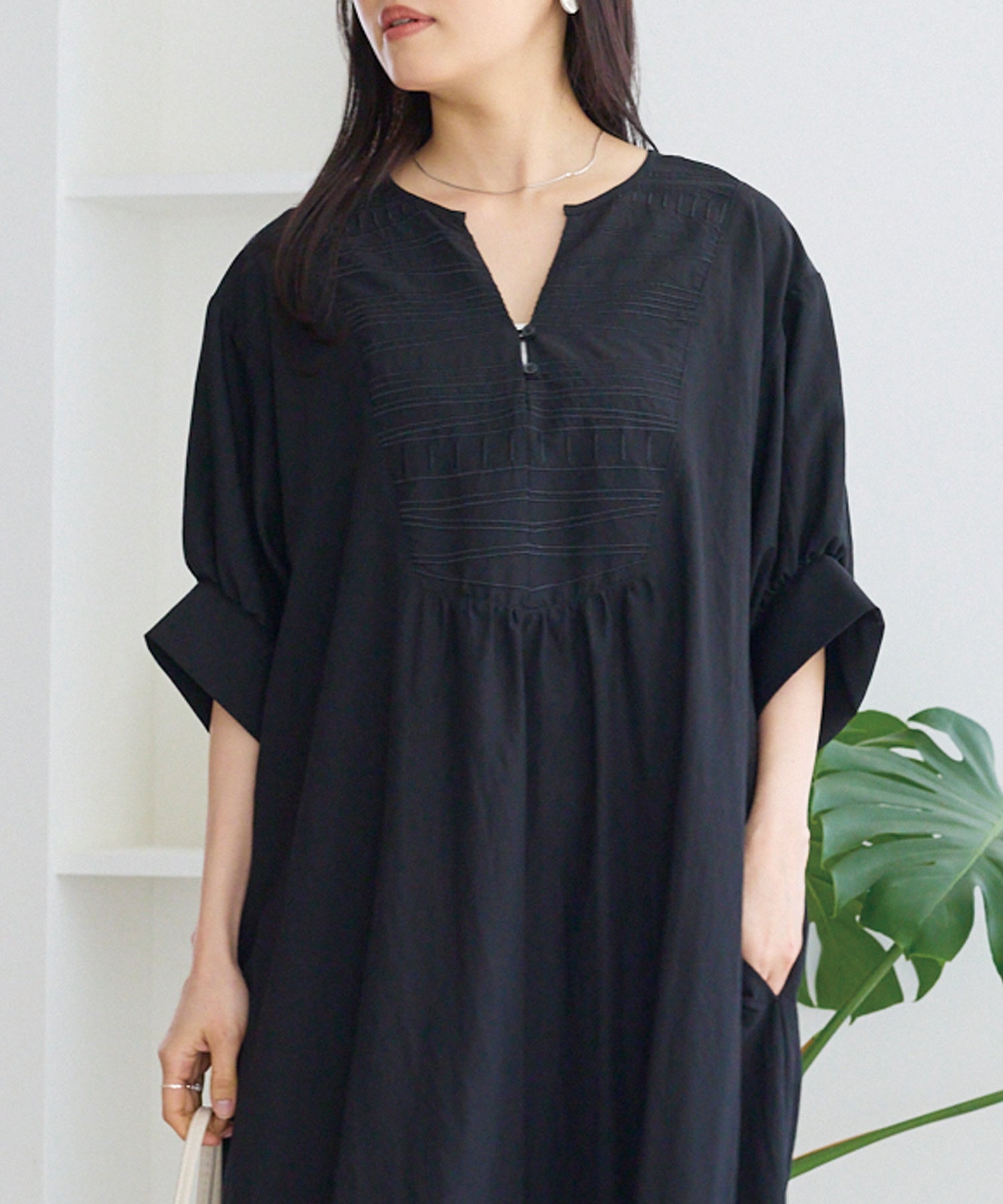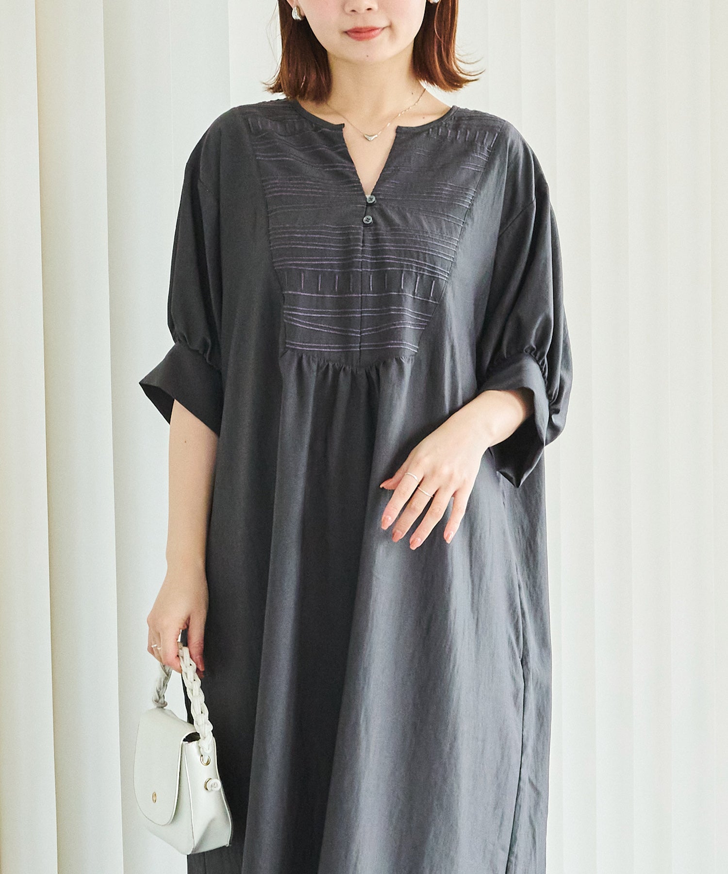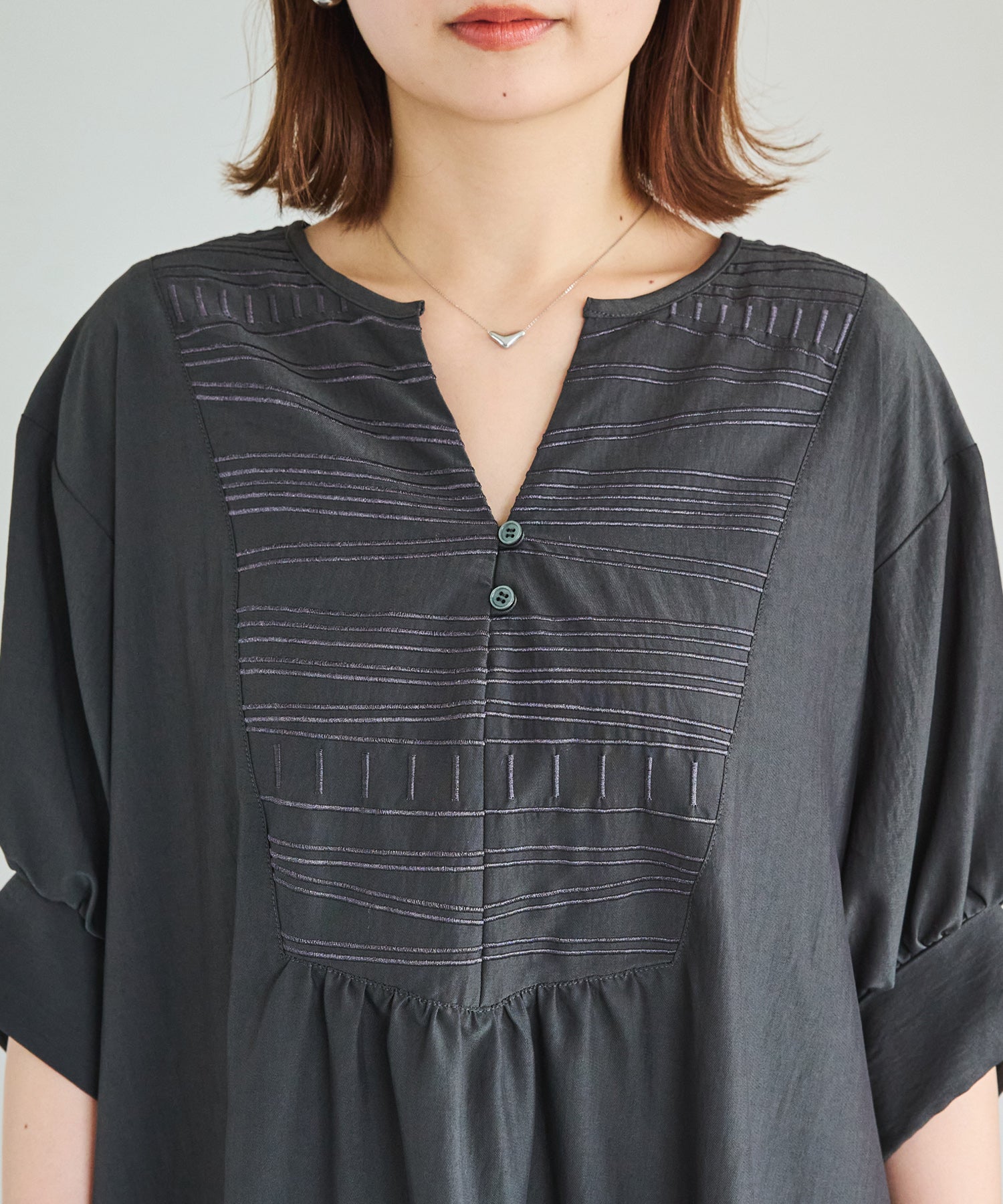 胸元の切替部分に施した繊細な刺繍が、シンプルながらも上品なアクセントに。