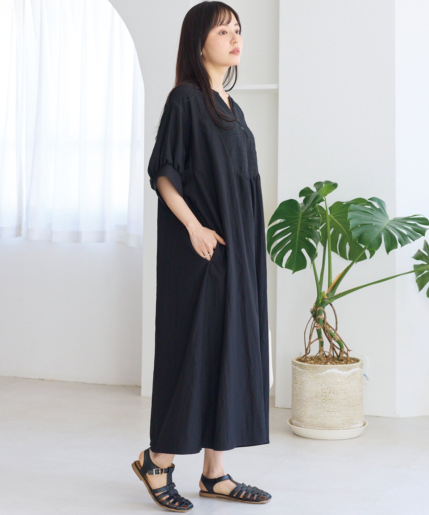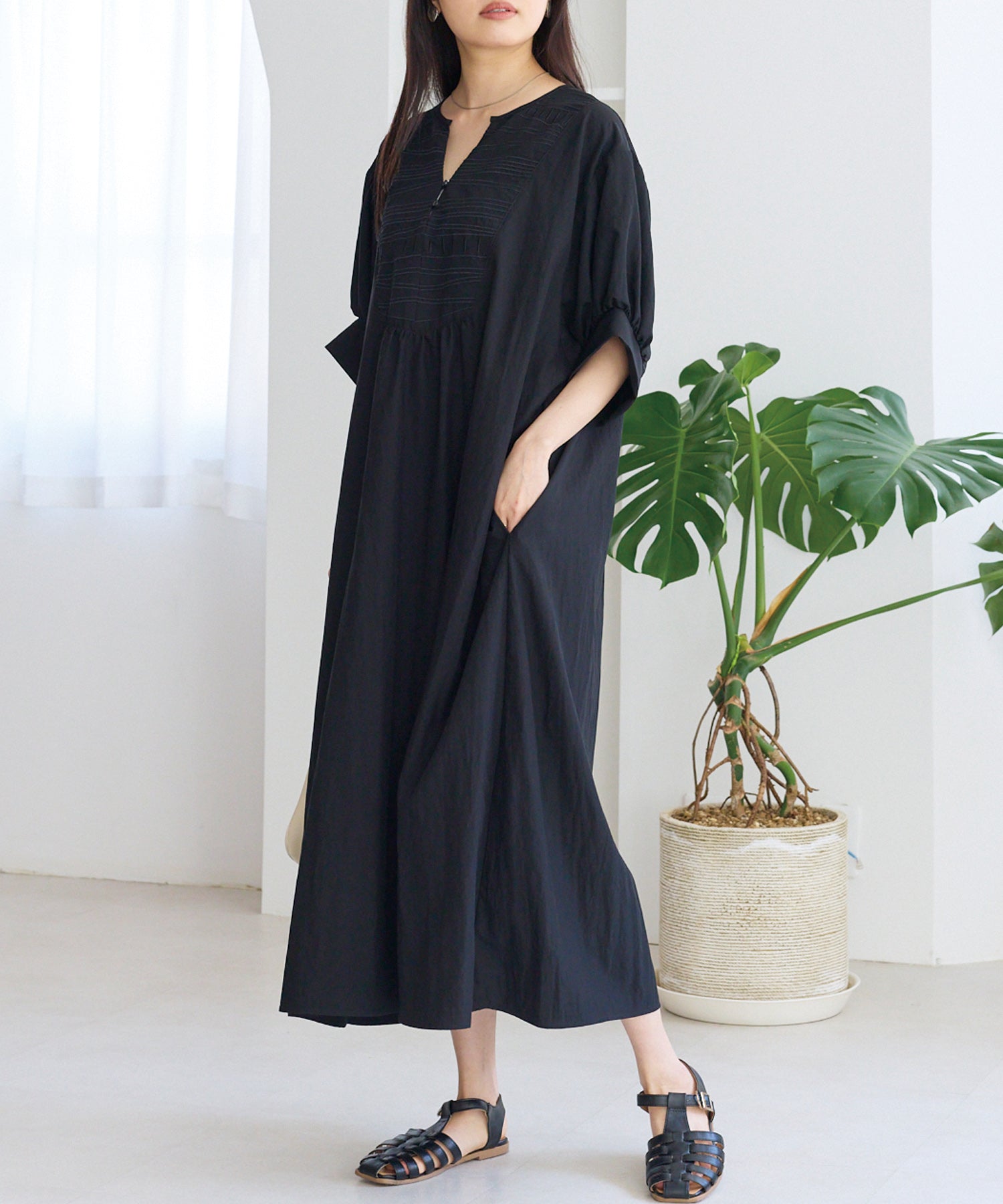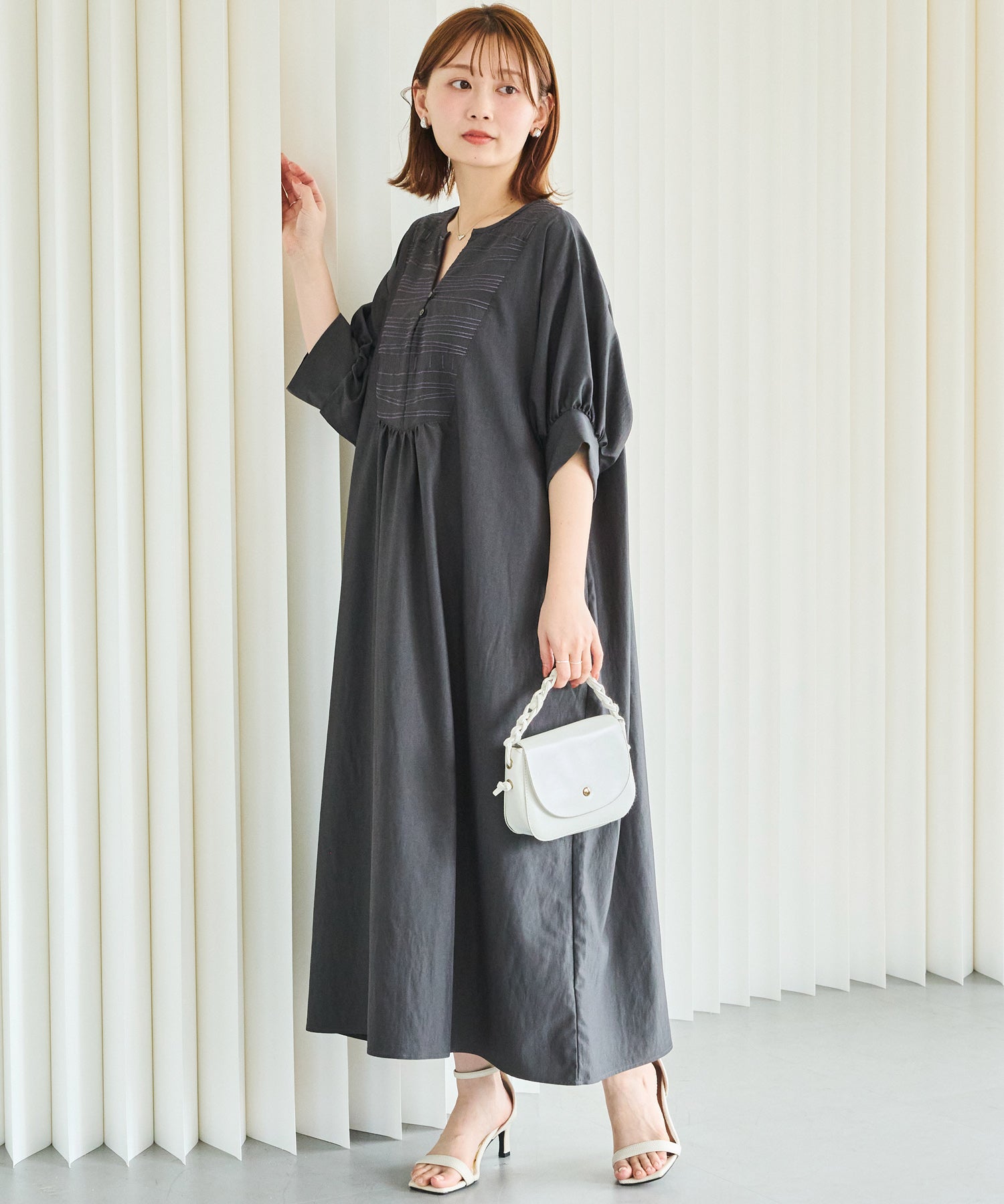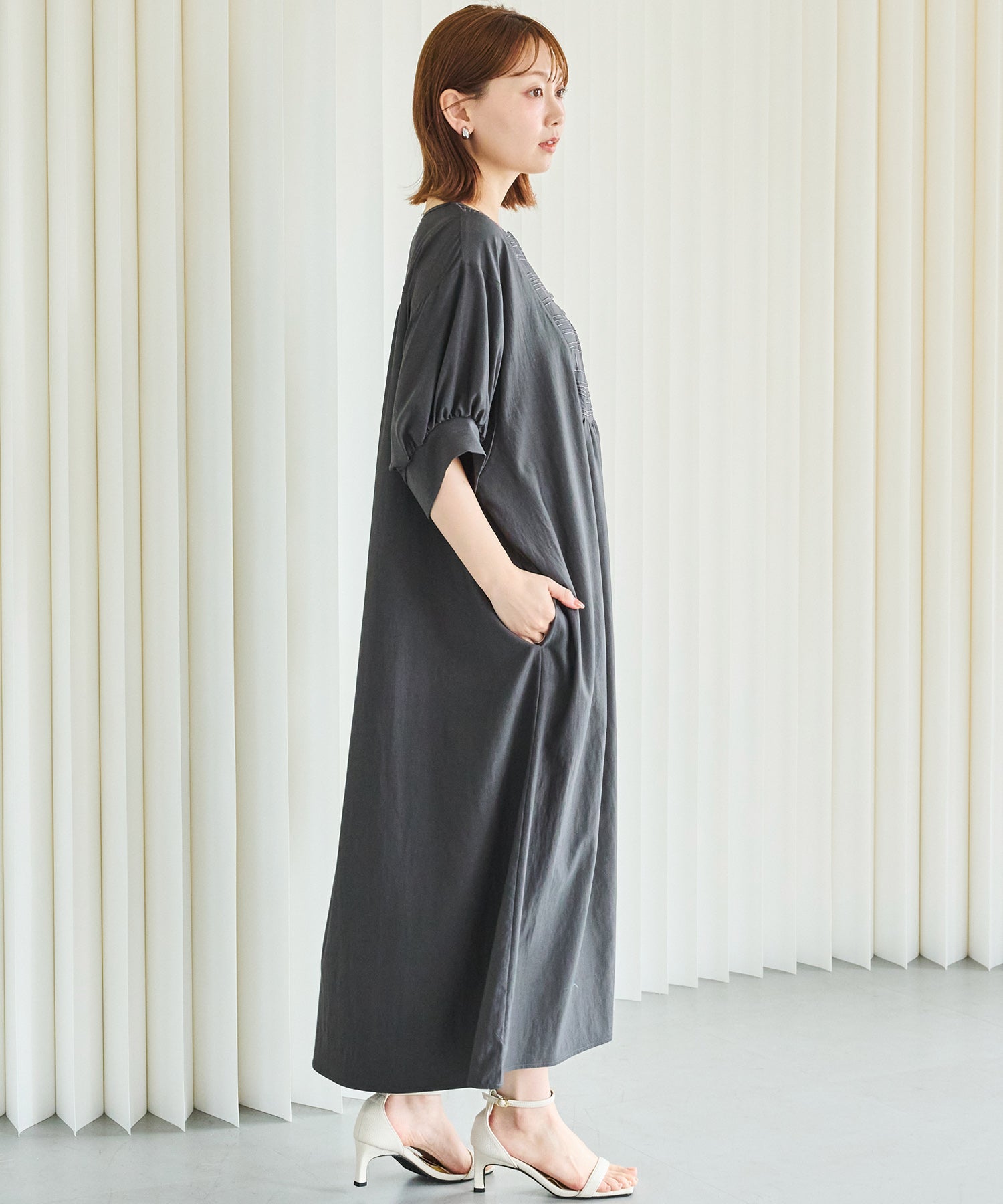 胸元の切替部分に施した繊細な刺繍が、シンプルながらも上品なアクセントに。