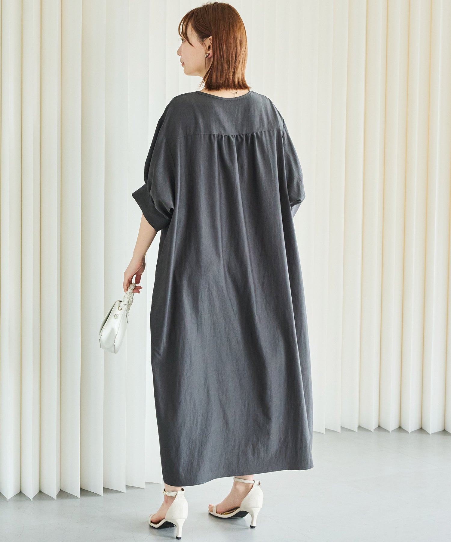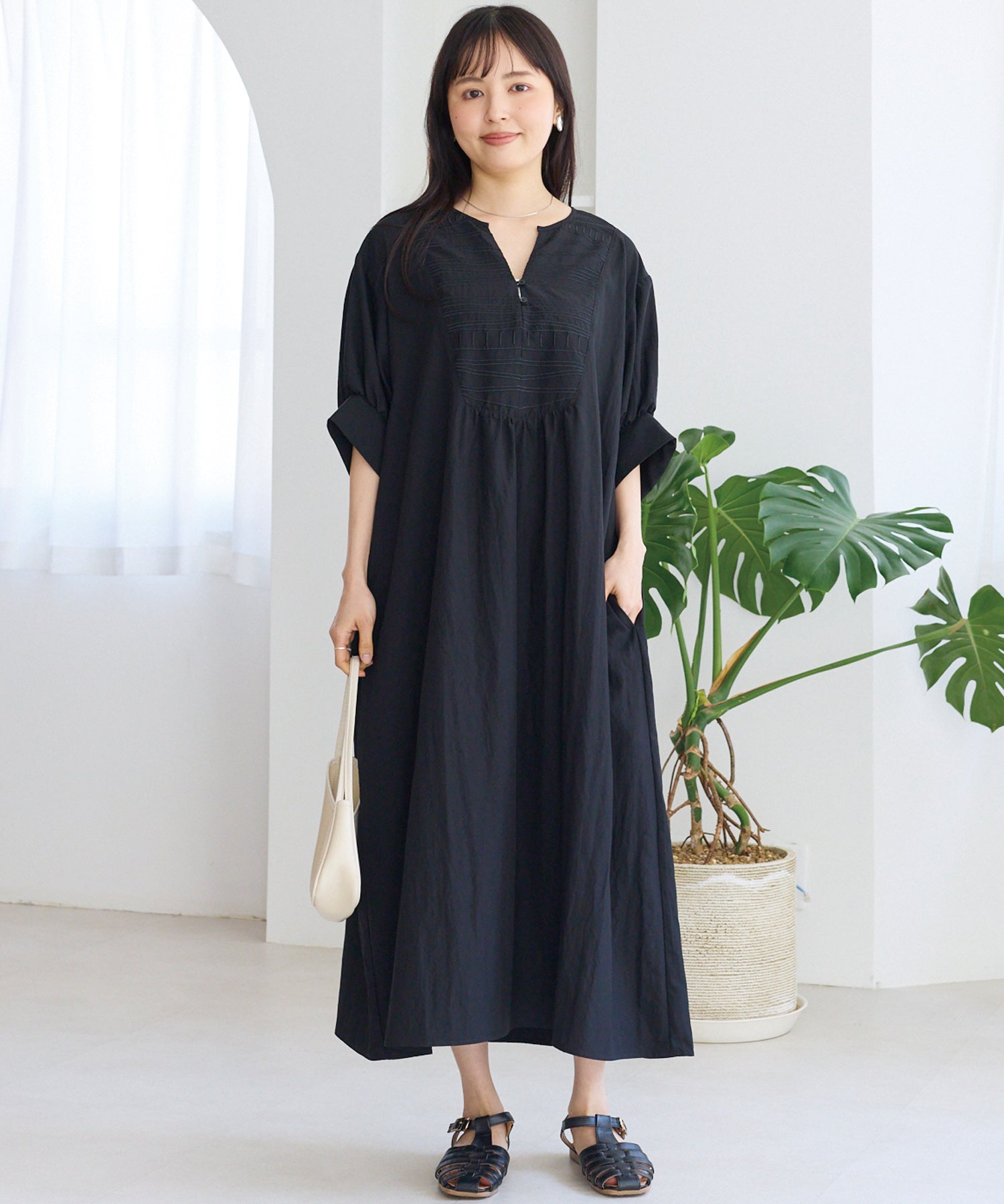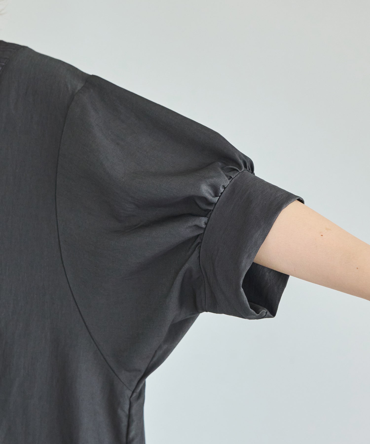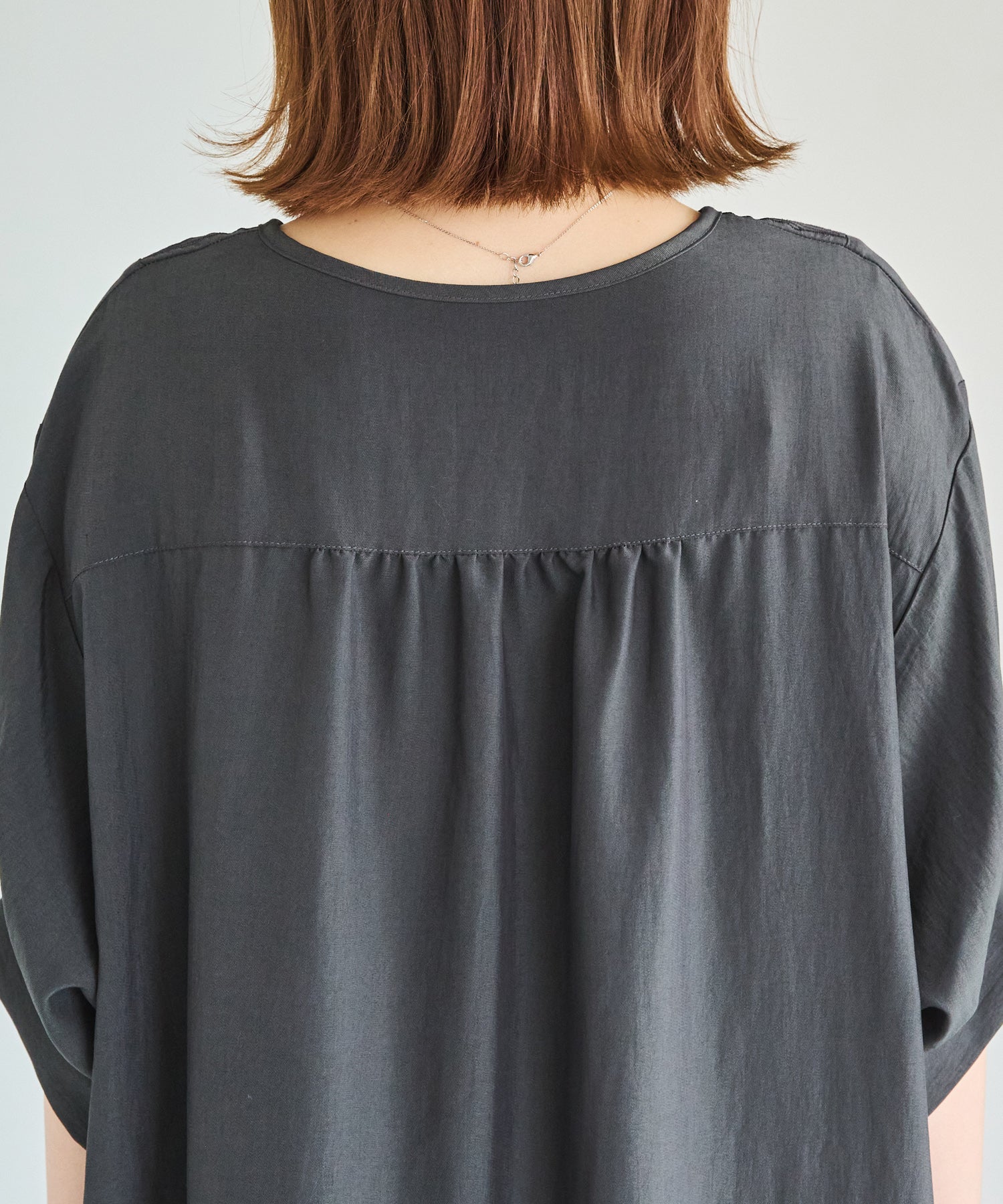 顔まわりをすっきり見せてくれるスリットネックで、抜け感のある印象に仕上げました。