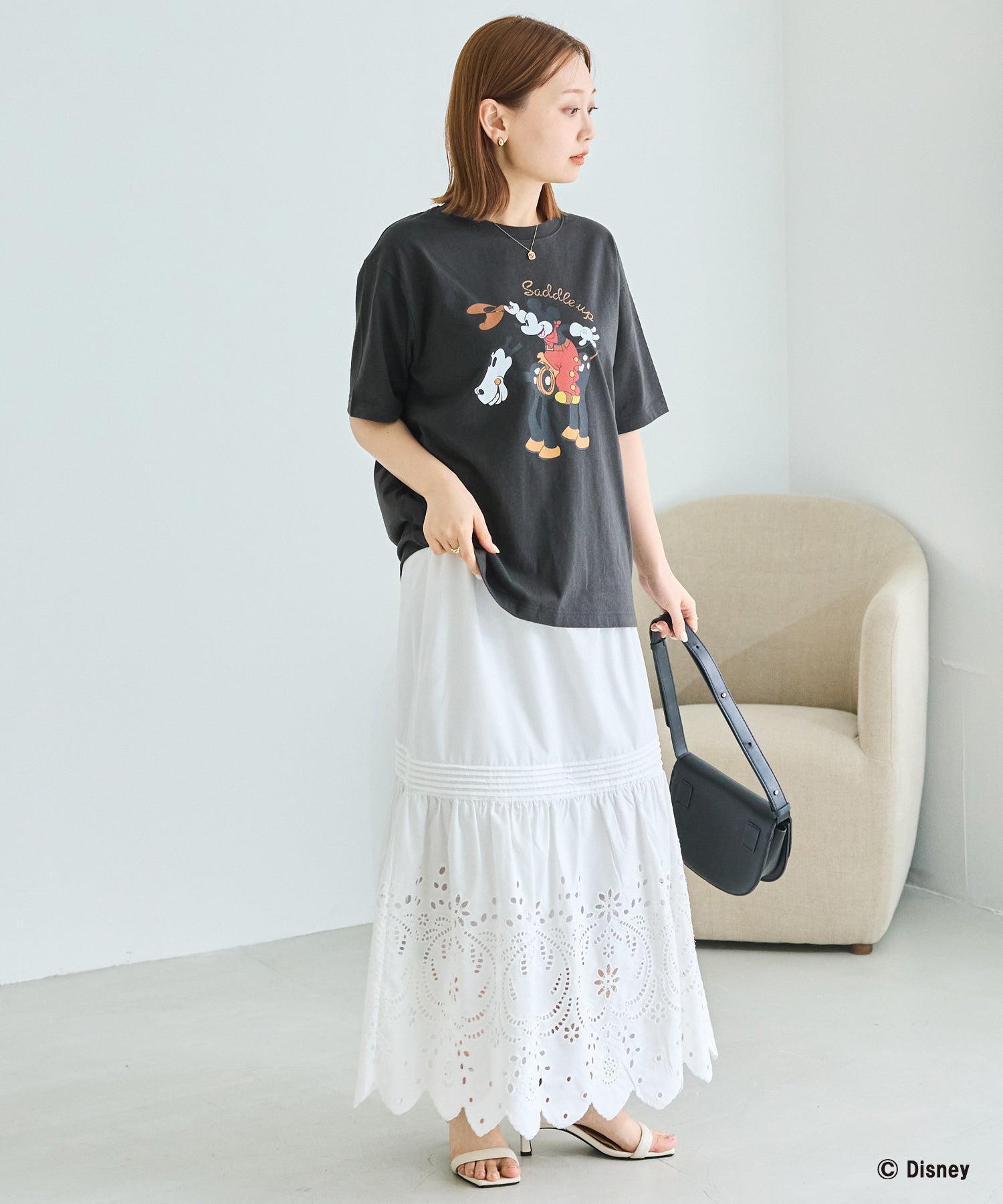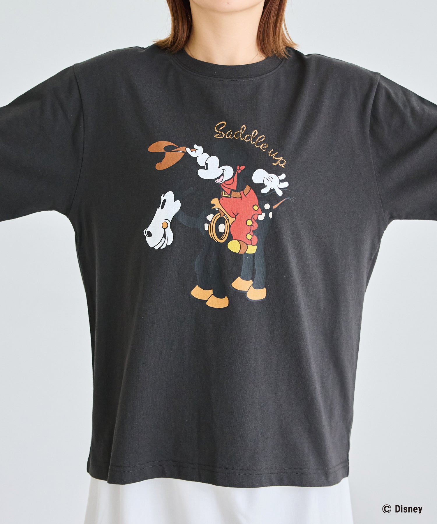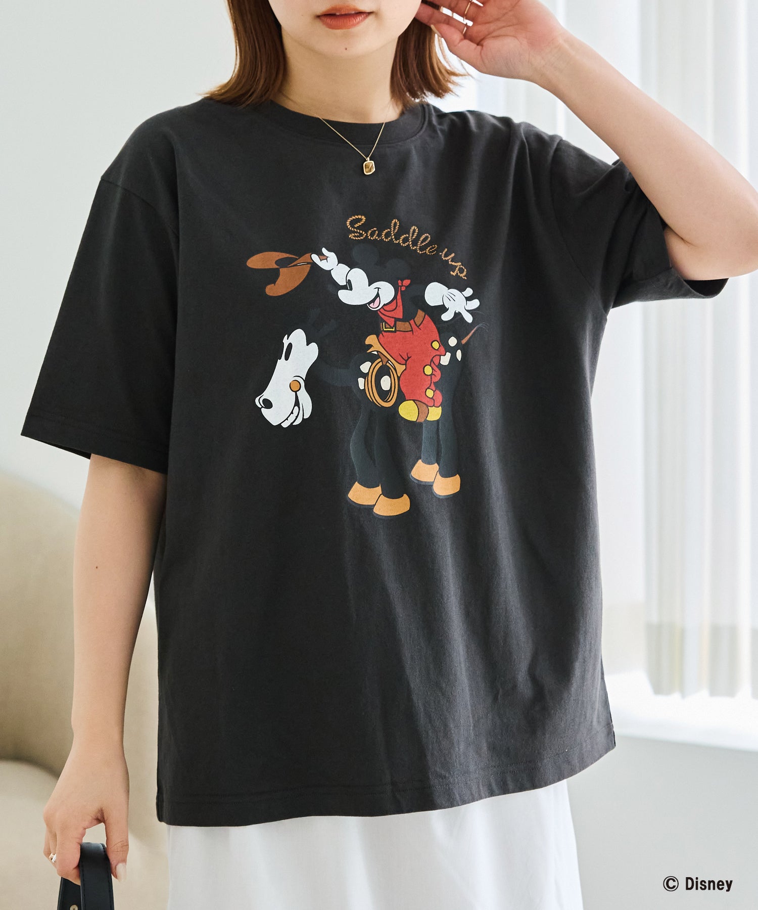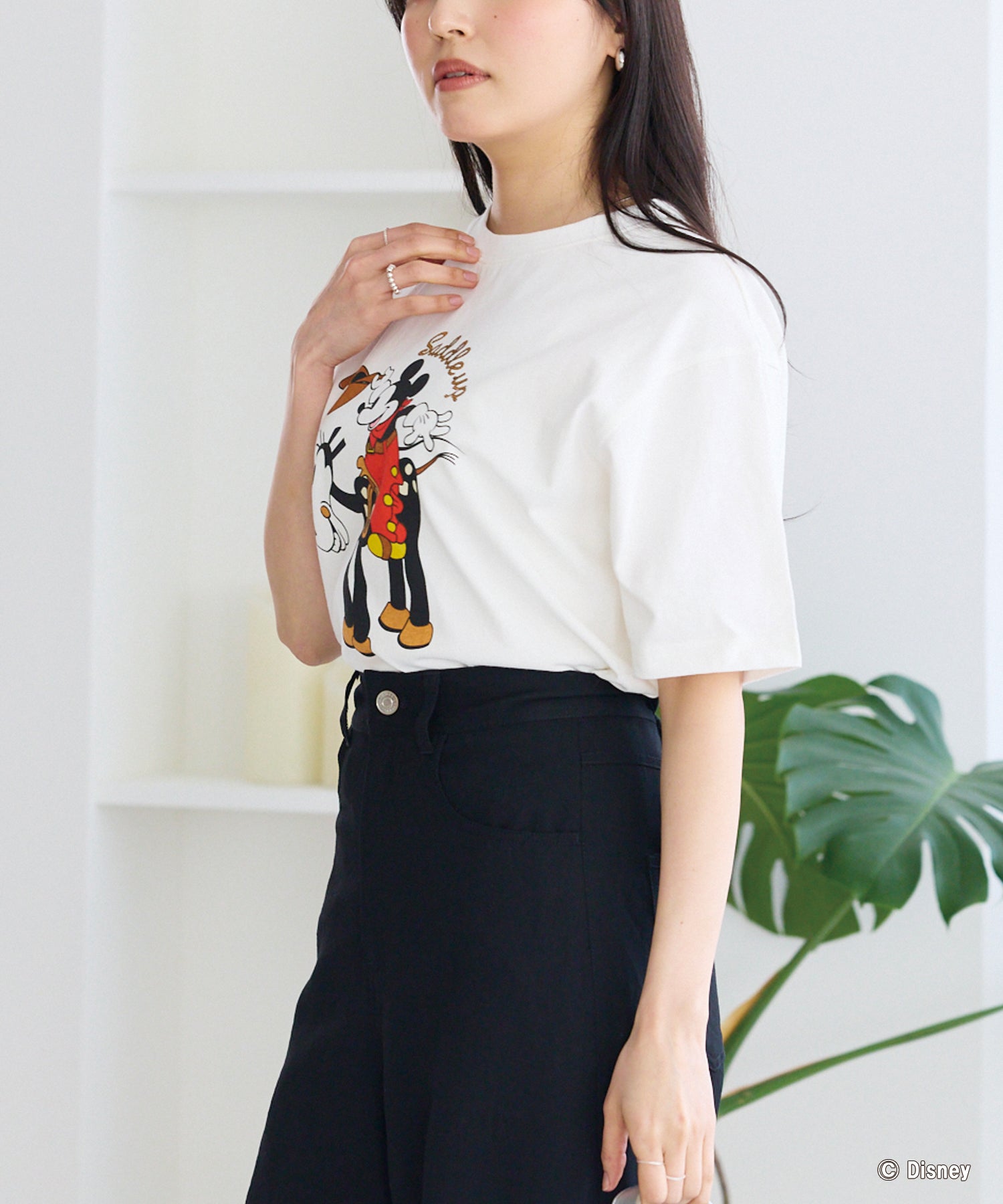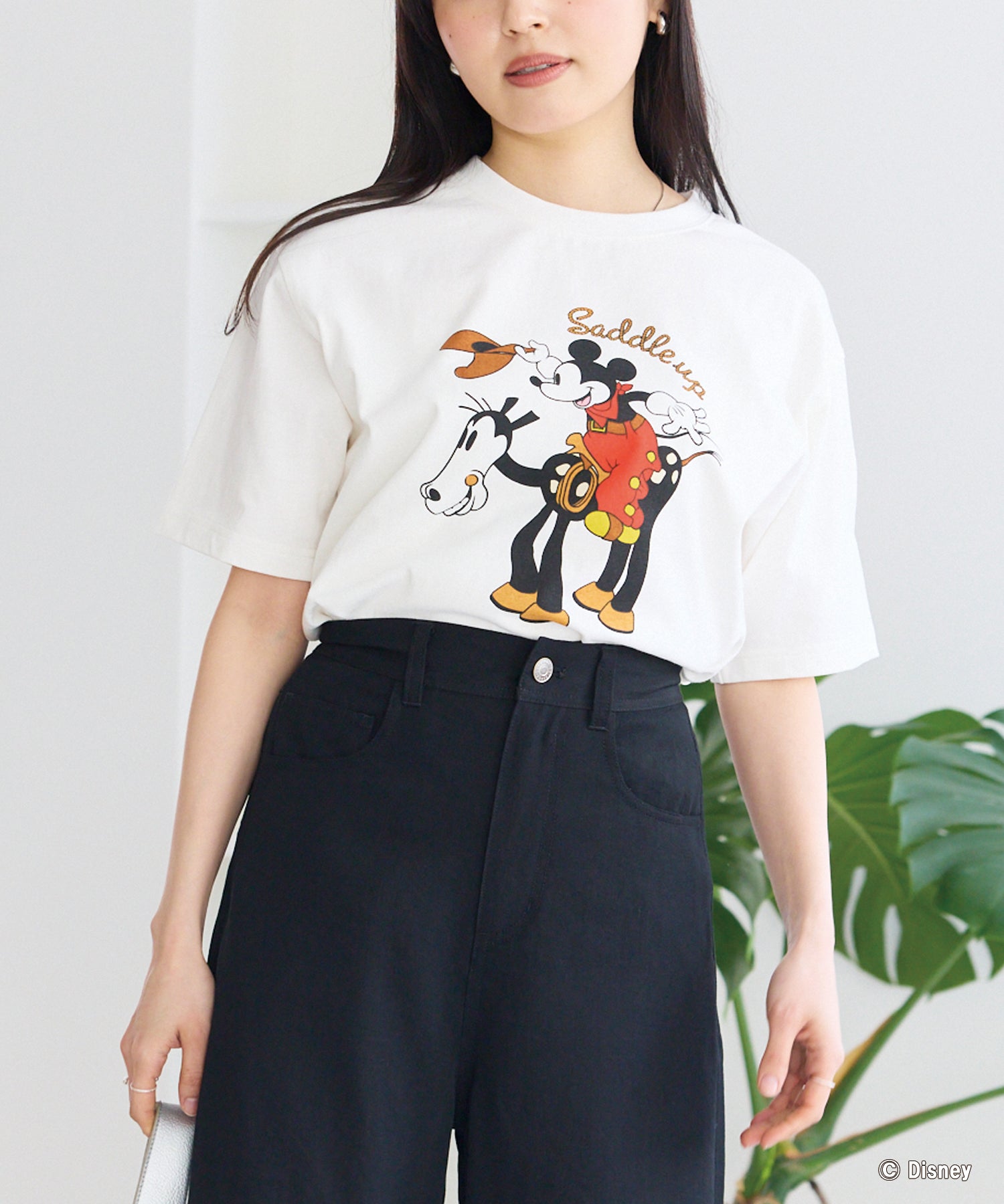 ■デザイントレンドのウエスタンテイストを取り入れた、存在感のあるプリントTシャツ。レトロタッチのミッキーデザインがこなれた雰囲気を演出し、フロントの遊び心あるグラフィックがコーデの主役に。バックには立体感のあるフロッキープリントのロゴを施し、シンプルながらも後ろ姿まで印象的に仕上げています。1枚で着映えする、カジュアルスタイルにぴったりのアイテムです。■素材肌触りの良いコットン素材を使用し、さらっとした着心地が魅力。程よい厚みで透けにくく、ロングシーズン着用可能です。デイリー使いしやすく、お手入れもしやすいのも嬉しいポイント。■コーディネートデニムやワイドパンツと合わせた王道カジュアルはもちろん、スカートと合わせた女性らしいスタイリングもおすすめ。ゆったりとしたシルエットで、アウトスタイルでもバランスよく着こなせます。1枚着としてはもちろん、シャツやジャケットのインナーとしても活躍する着回し力の高いアイテムです。