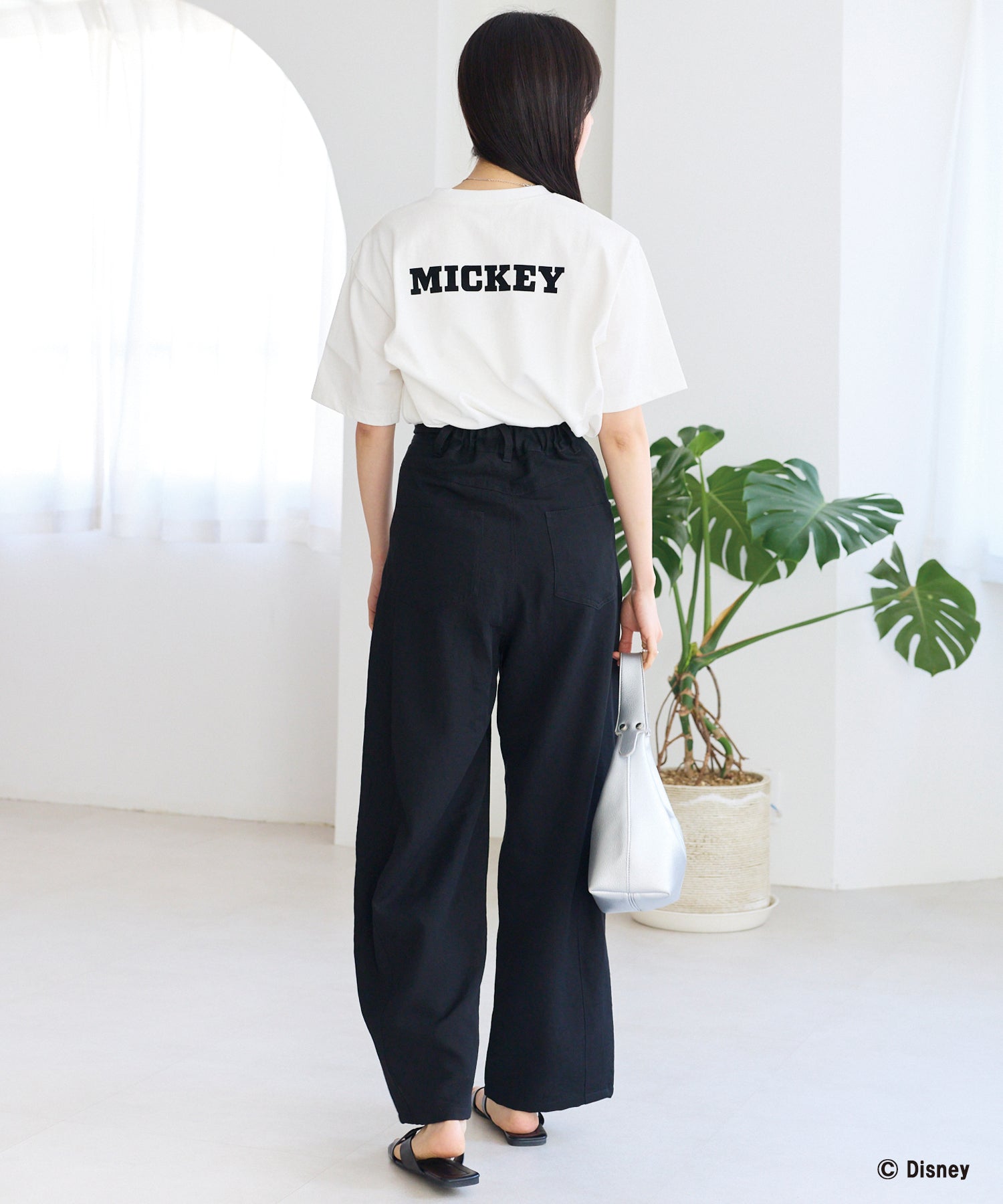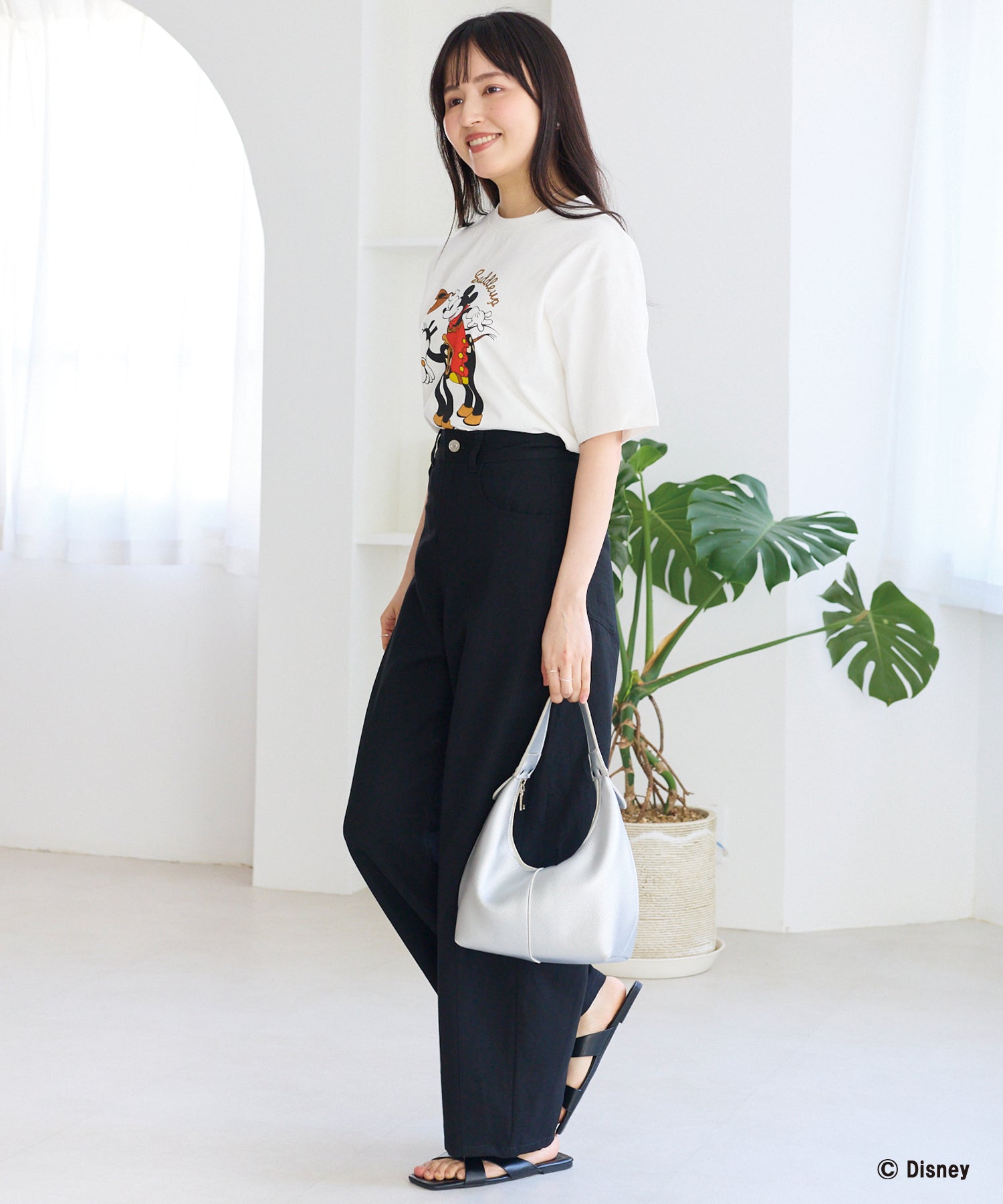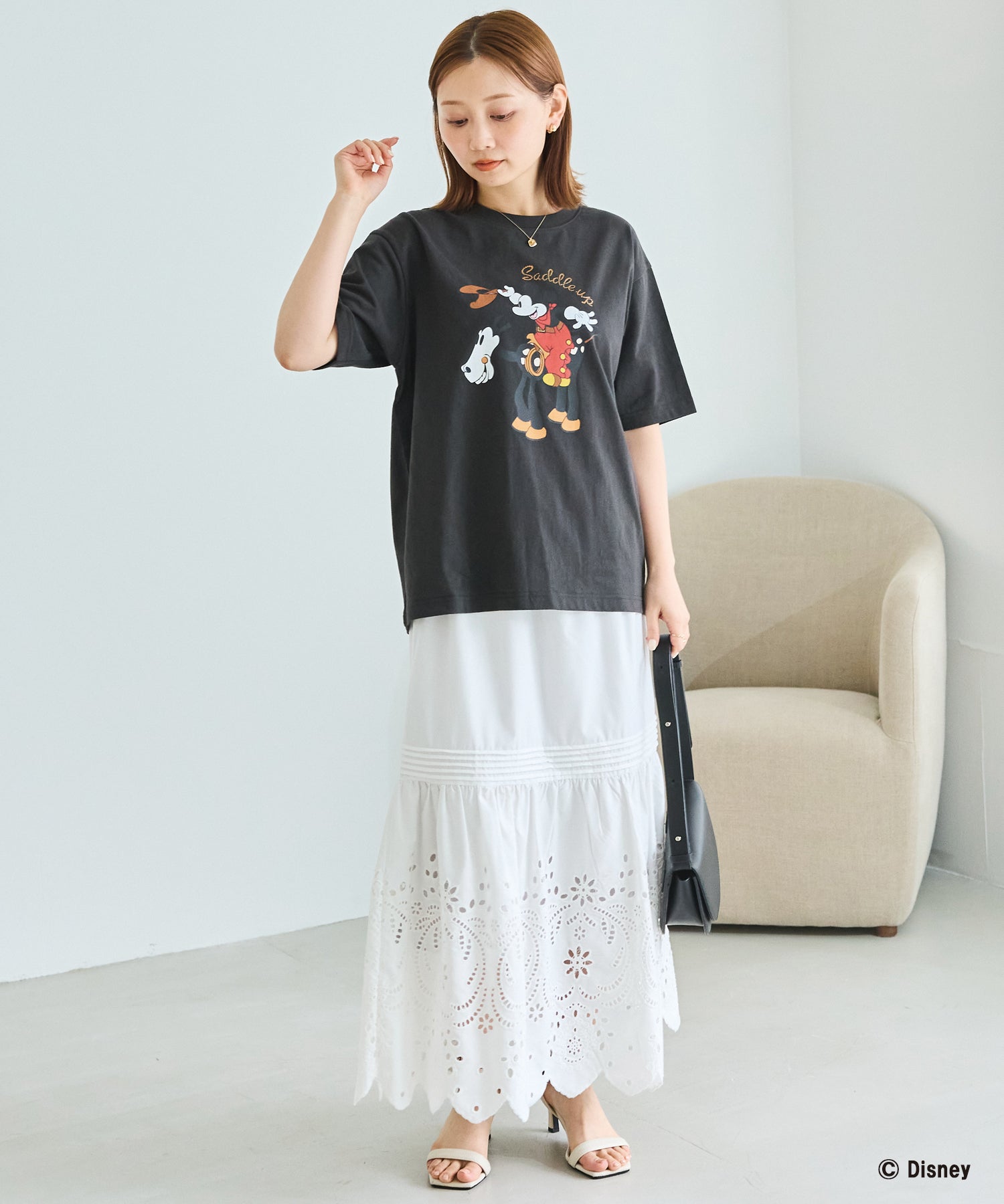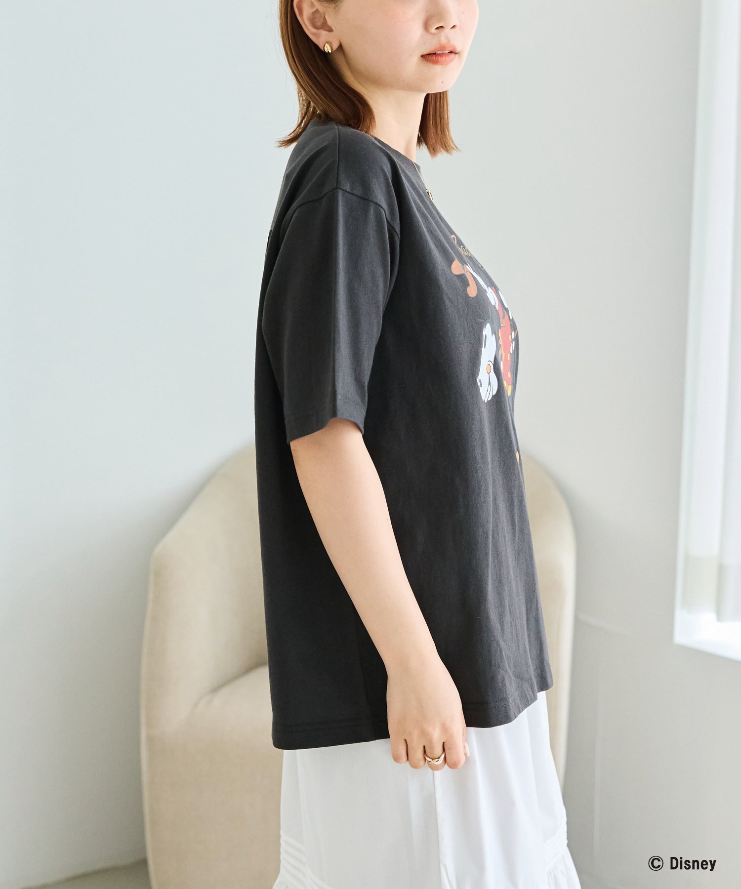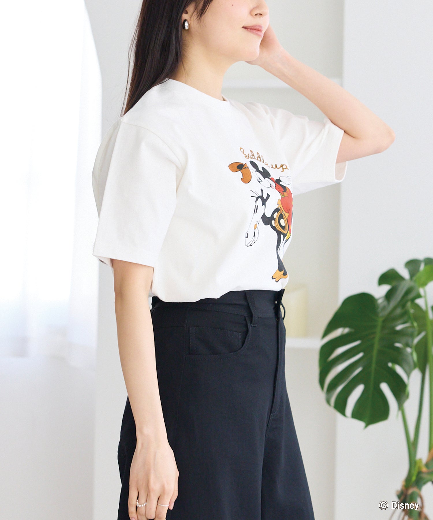 ■デザイントレンドのウエスタンテイストを取り入れた、存在感のあるプリントTシャツ。レトロタッチのミッキーデザインがこなれた雰囲気を演出し、フロントの遊び心あるグラフィックがコーデの主役に。バックには立体感のあるフロッキープリントのロゴを施し、シンプルながらも後ろ姿まで印象的に仕上げています。1枚で着映えする、カジュアルスタイルにぴったりのアイテムです。■素材肌触りの良いコットン素材を使用し、さらっとした着心地が魅力。程よい厚みで透けにくく、ロングシーズン着用可能です。デイリー使いしやすく、お手入れもしやすいのも嬉しいポイント。■コーディネートデニムやワイドパンツと合わせた王道カジュアルはもちろん、スカートと合わせた女性らしいスタイリングもおすすめ。ゆったりとしたシルエットで、アウトスタイルでもバランスよく着こなせます。1枚着としてはもちろん、シャツやジャケットのインナーとしても活躍する着回し力の高いアイテムです。